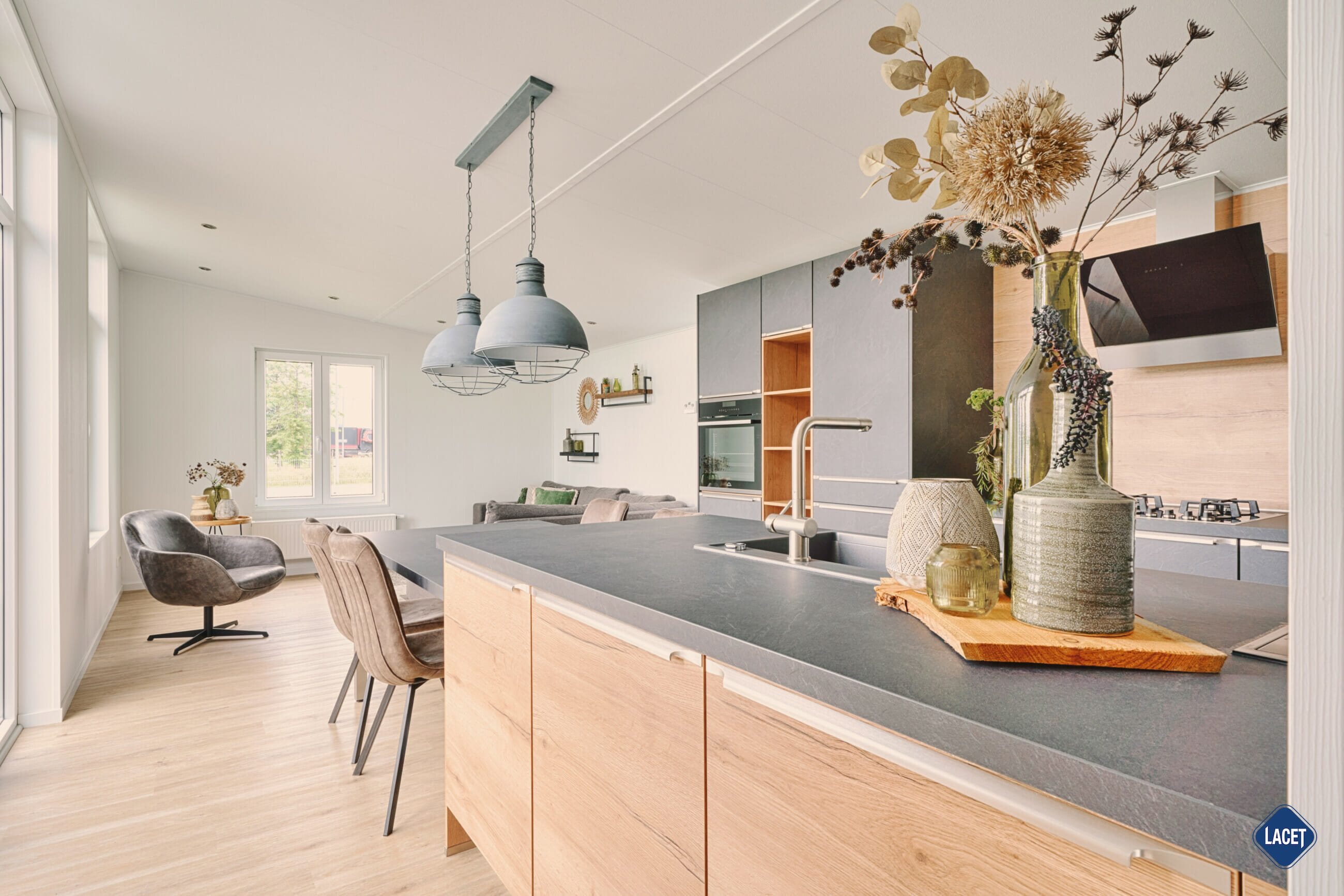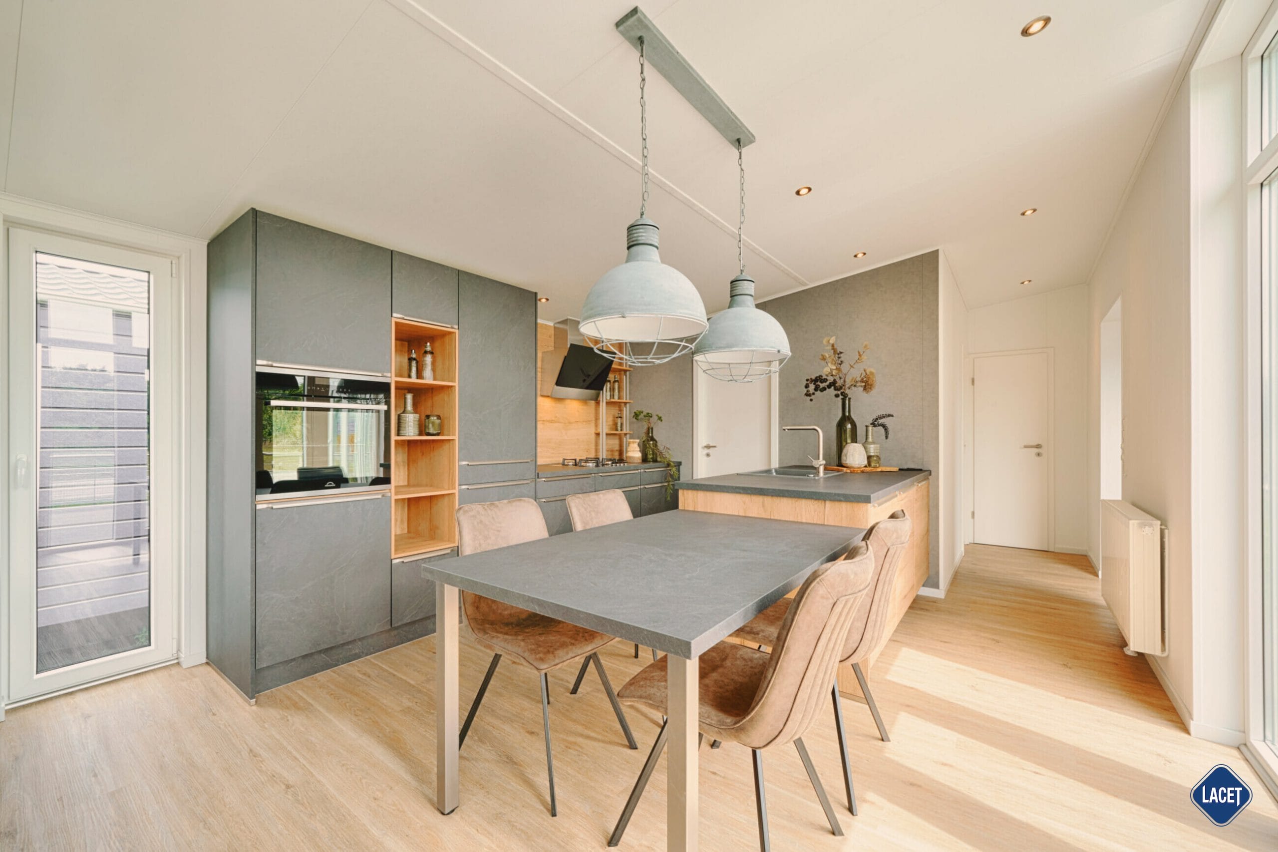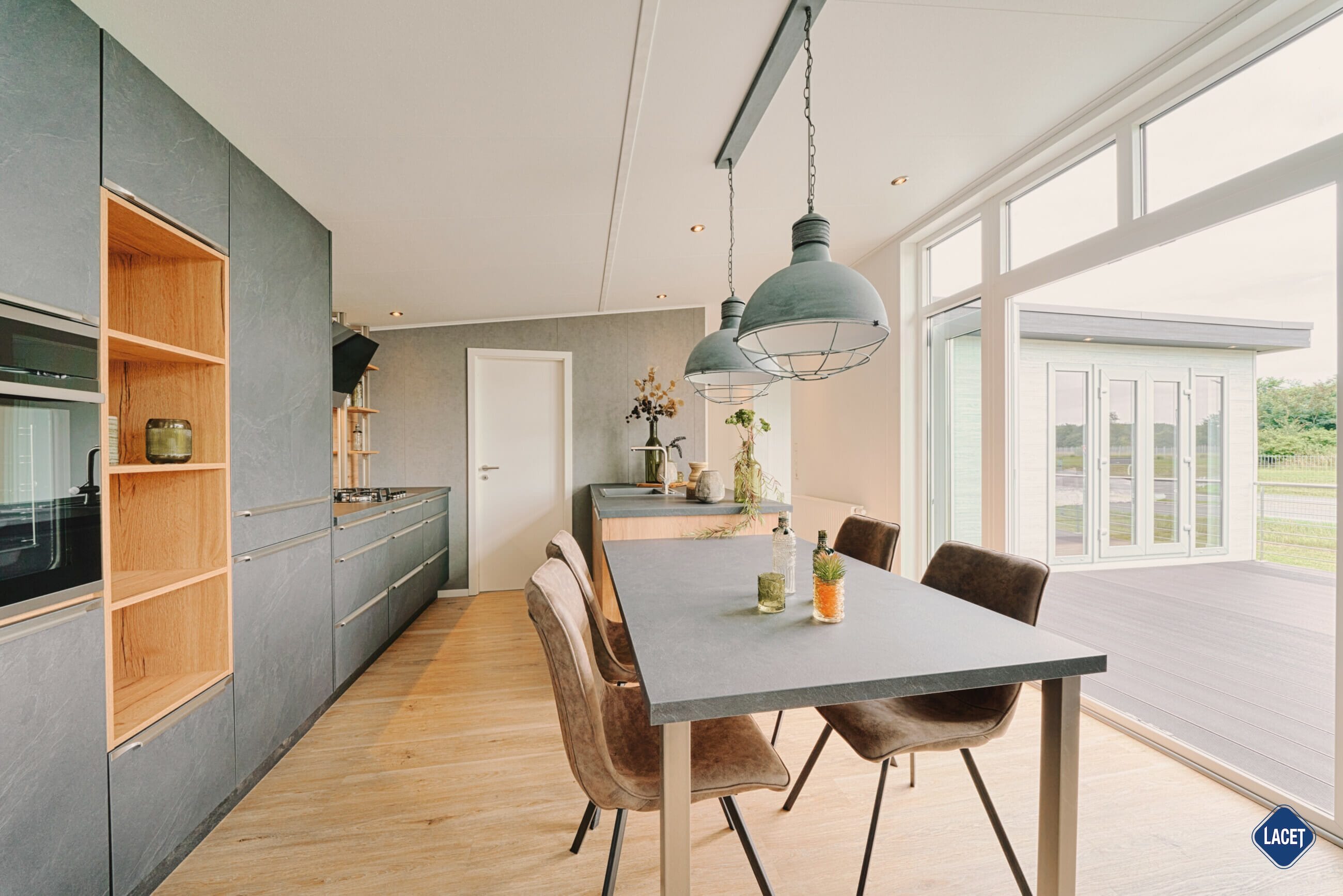 Innovatives Wohnen neu definiert: Das funktionale L-Design des Mobilheim LACET Madita trennt Wohn- und Rückzugsbereiche sinnvoll voneinander und schafft auf 70 Quadratmetern vielseitige Möglichkeiten für alle Lebenssituationen. Der offene Wohn- und Essbereich bildet das Herzstück des Mobilheims. Weitläufige Fenster durchfluten den Raum mit natürlichem Licht und sorgen für eine einladende, entspannte Atmosphäre. Direkt angrenzend lädt eine großzügige Terrasse zum Verweilen im Freien ein – perfekt für entspannte Stunden unter freiem Himmel, ein ausgedehntes Frühstück oder gesellige Grillabende. Nahtlos fügt sich die moderne Küche an den Wohnbereich an und vereint Funktionalität mit stilvoller Eleganz. Offene Regale und ein großzügiger Vorratsschrank bieten praktischen Stauraum, während hochwertige Einbaugeräte wie Kühl-Gefrier-Kombigerät, leistungsstarkes Gas-Kochfeld und Backofen das Kochen zum Vergnügen machen. Abgerundet wird die Ausstattung durch elegante Armaturen, die den Küchenbereich zu einem echten Design-Highlight machen.