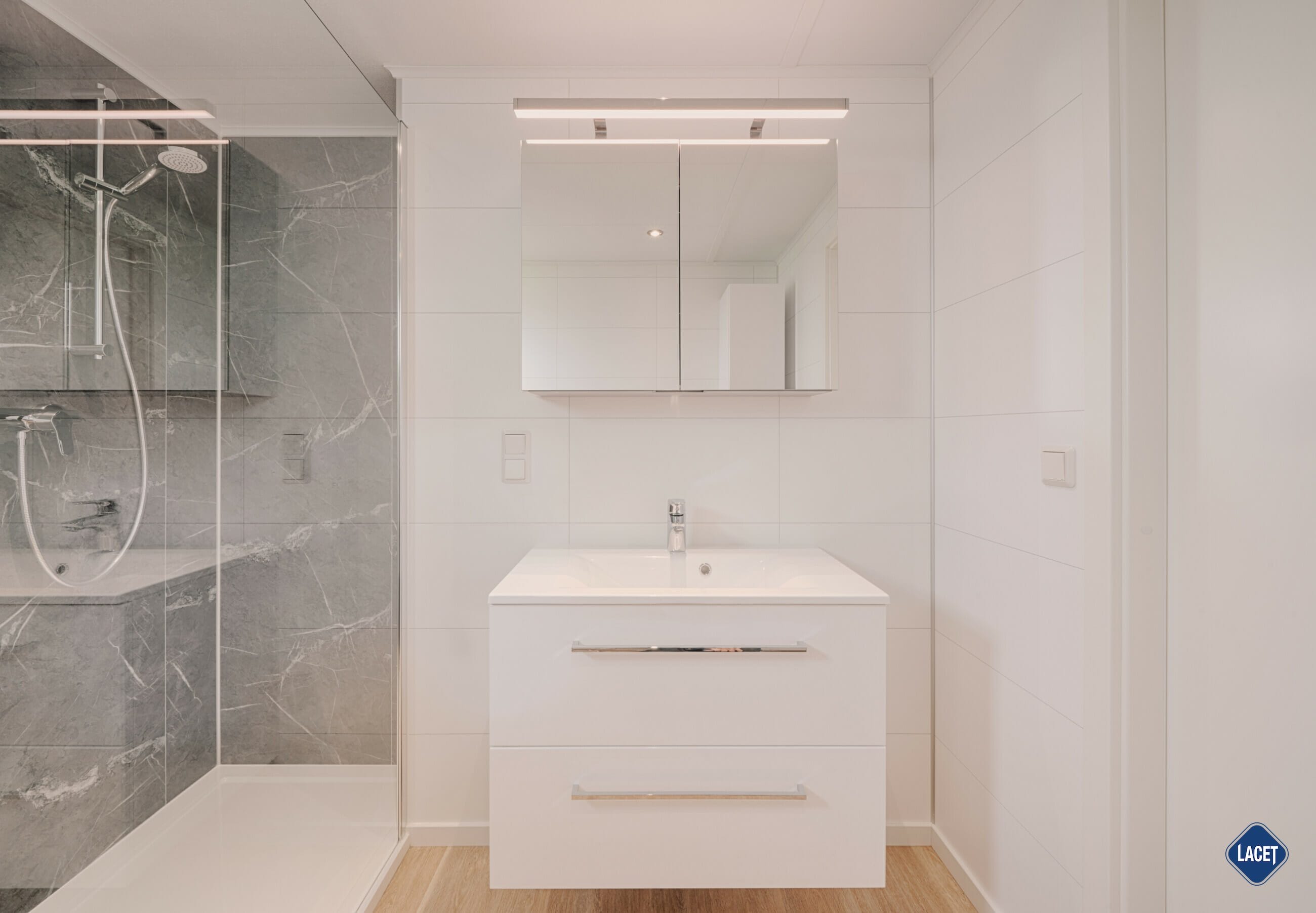 Nach gemeinsamen Stunden im offenen Wohn- und Küchenbereich laden die Schlafzimmer des LACET Madita zu erholsamen Nächten ein – individuell abgestimmt auf Ihre Lebenssituation. Neben dem Hauptschlafzimmer steht ein zusätzlicher Raum zur Verfügung, der flexibel genutzt werden kann: Ob als Kinderzimmer, Gästezimmer oder Homeoffice. Das stilvoll ausgestattete Badezimmer überzeugt mit einer extra breiten Dusche (140 cm), einem Luxus-Waschtisch samt Spiegelschrank sowie hochwertigen Armaturen, die eine elegante Wohlfühlatmosphäre schaffen. Ein separates WC ergänzt die Ausstattung und sorgt für zusätzlichen Komfort im Alltag. Praktische Lösungen runden das Wohnkonzept ab: Ein großzügiger Hauswirtschaftsraum, direkt von der Küche aus begehbar, bietet Platz für Haushaltsgeräte, Reinigungsutensilien und weiteren Stauraum. So bleibt Ihr Mobilheim dauerhaft aufgeräumt, übersichtlich und funktional.